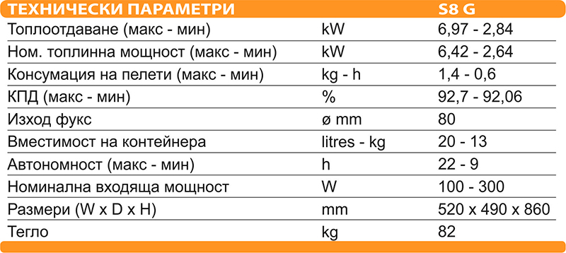 • Консумираната мощност на пелетната камина е 100W при нормална работа и до 300W при първоначално запалване.