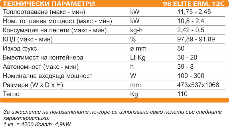 - Консумираната мощност на пелетната камина е 100W при нормална работа и до 300W при първоначално запалване.